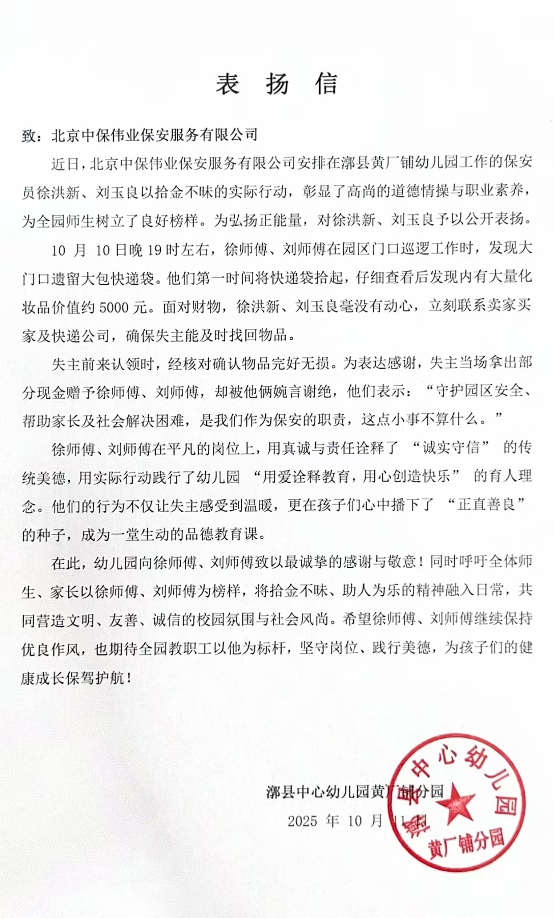 事件發(fā)生后,幼兒園對(duì)二人善舉高度肯定并公開(kāi)表?yè)P(yáng)。公司得知后,第一時(shí)間向兩位員工表達(dá)了肯定。公司項(xiàng)目負(fù)責(zé)人李玉生表示:他們是公司驕傲,詮釋了真正的職業(yè)道德與社會(huì)責(zé)任,希望保安員們以他們?yōu)榘駱?,?jiān)守初心、踐行美德。